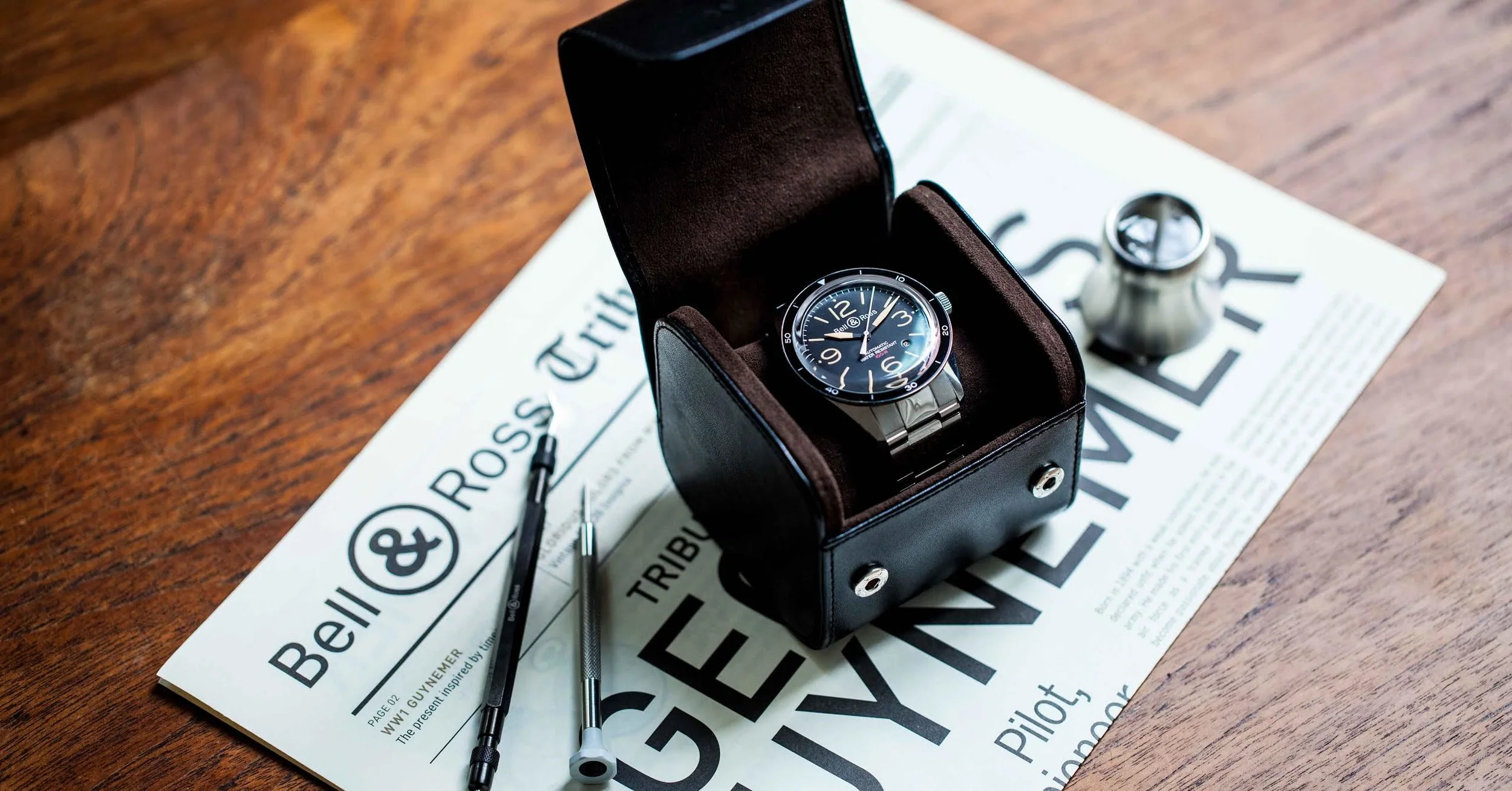 The accessories come in black and camel leather, the brands trademark colours, and include two cases for one watch, a solid one and a smooth one, a soft case or holder for 6 watches, and a card holder to slide into a pocket or a briefcase. The perfect partner for your BR01?